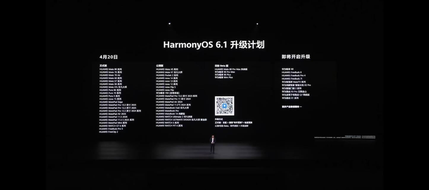 4 月 20 日,华为举办了 Pura 系列及全场景新品发布会,正式推出了华为 Pura X Max、华为 MateBook 14 鸿蒙版等多款极具竞争力的新品。备受瞩目的 Pura 90 系列将出厂搭载全新的 HarmonyOS 6.1,同时,诸如华为 Mate 80 等多款存量旗舰产品也正式确认支持升级,成为首批核心的 HarmonyOS 6.1 适配机型。